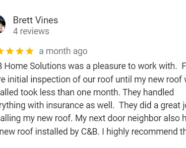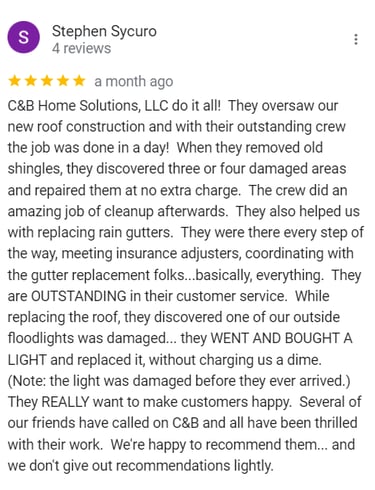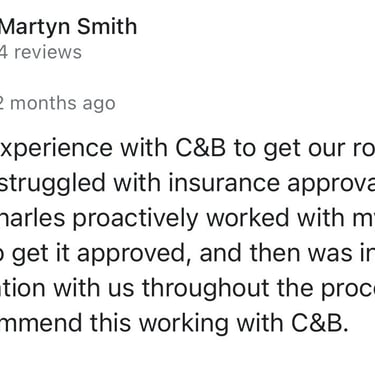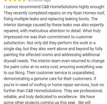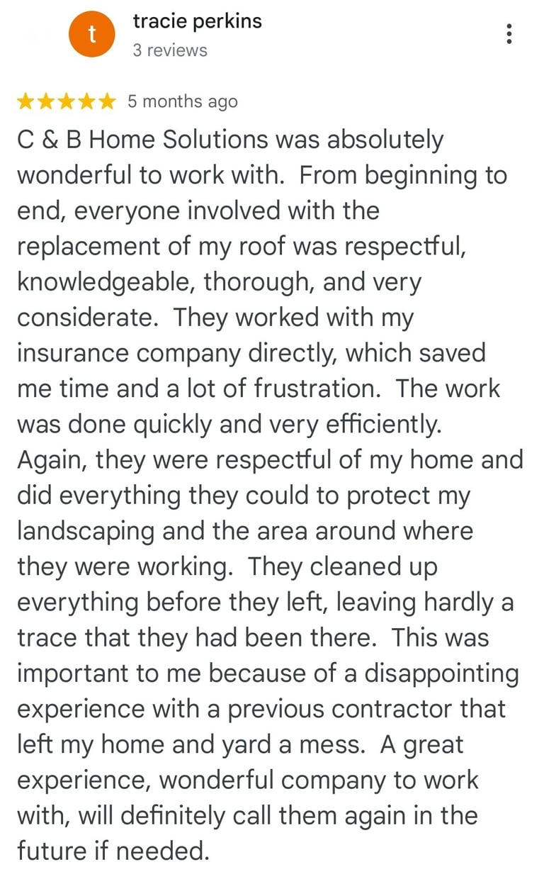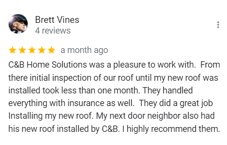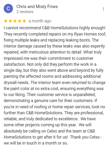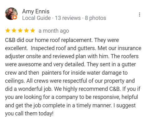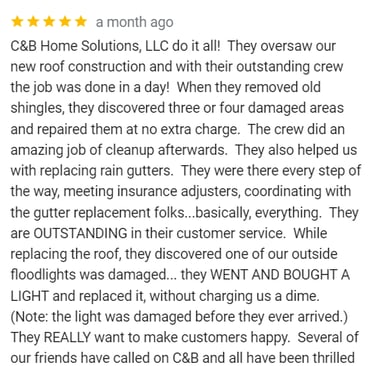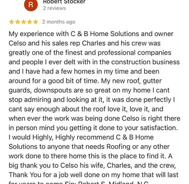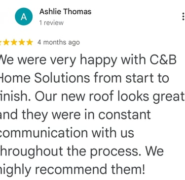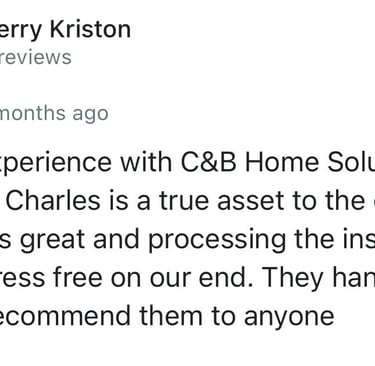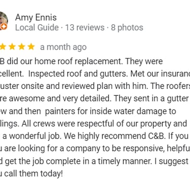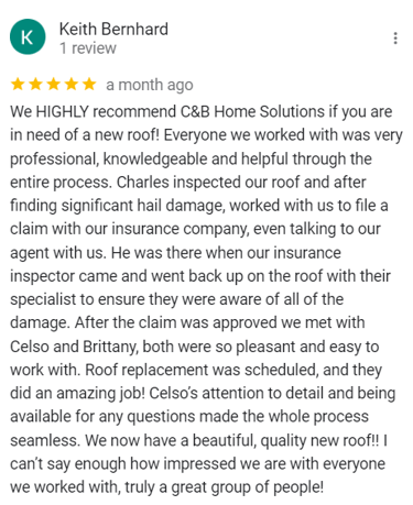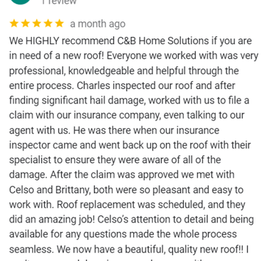 "In June of 2023 C&B Home Solutions reroofed our 22 yr old roof that Celso had found hail damage on. He worked with us and our insurance adjustor to get the entire claim which payed for the new roof minus our deductible. He and his wife were very conscientious, helpful, and professional throughout the entire process. If we had questions he was quick to respond by text or email and was always very courteous. His work crew worked for 12 hours in one day to remove the old roof and reroof the house. They even took down an old satellite dish at our request that had been there for years that we no longer used. They replaced any rotten boards they found which were not many to further protect our home. They offered an upgrade over felt that we had to pay additionally for but felt like it was an additional protection against leakage. Afterwards they made sure we were completely satisfied and even came back to help us remove the remaining cables from the satellite that his crew could not cut down as it was in threaded into the attic. So far we have had no problems with their work and after this full week of rain no leaks or issues have occurred. I would highly recommend them if you are considering a new roof and have them inspect first for damage that your insurance may cover."