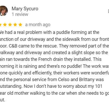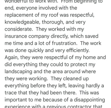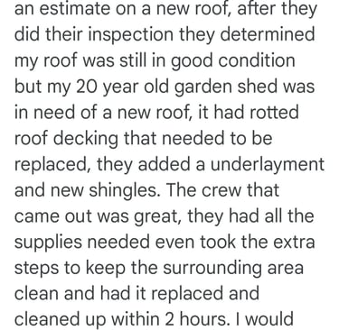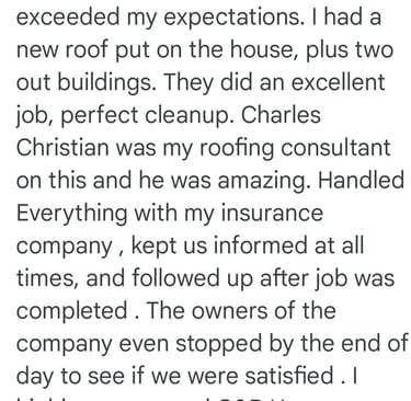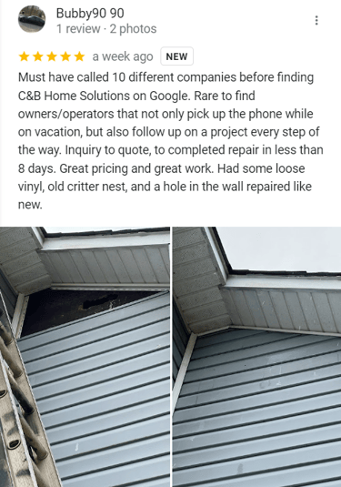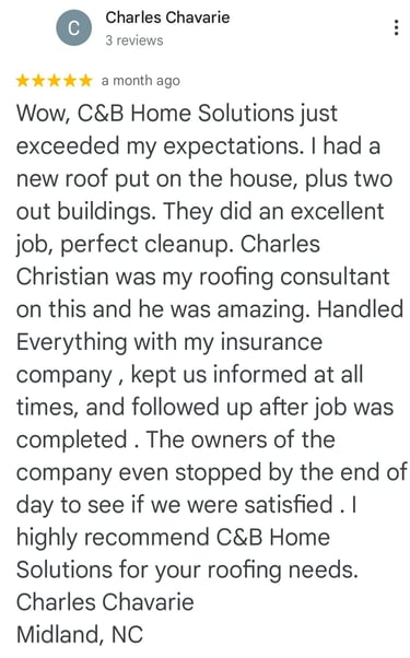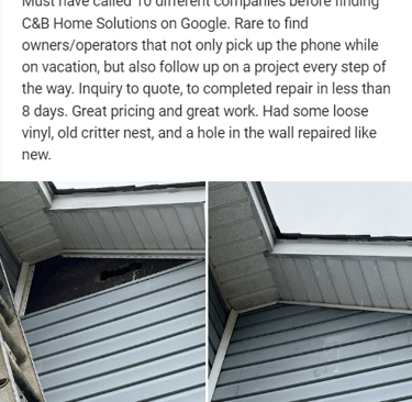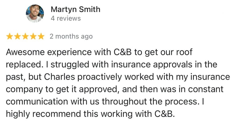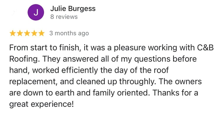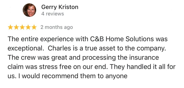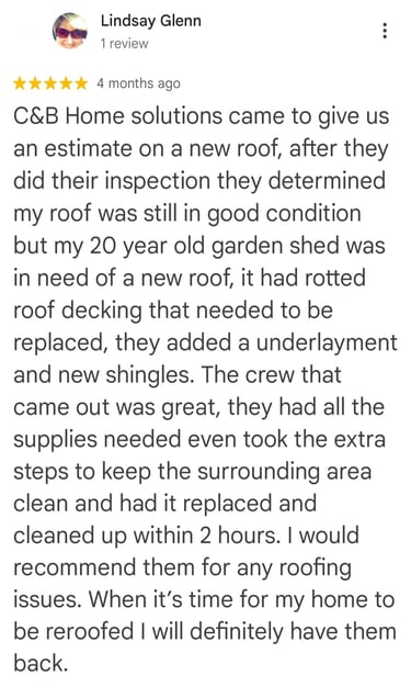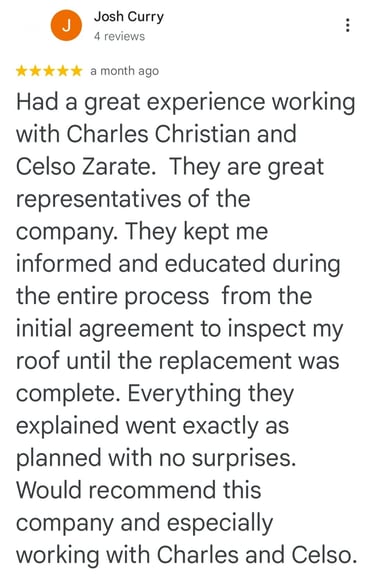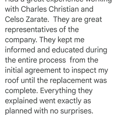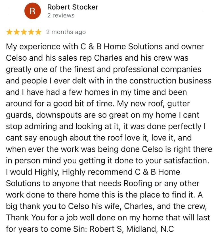 "In June of 2023 C&B Home Solutions reroofed our 22 yr old roof that Celso had found hail damage on. He worked with us and our insurance adjustor to get the entire claim which payed for the new roof minus our deductible. He and his wife were very conscientious, helpful, and professional throughout the entire process. If we had questions he was quick to respond by text or email and was always very courteous. His work crew worked for 12 hours in one day to remove the old roof and reroof the house. They even took down an old satellite dish at our request that had been there for years that we no longer used. They replaced any rotten boards they found which were not many to further protect our home. They offered an upgrade over felt that we had to pay additionally for but felt like it was an additional protection against leakage. Afterwards they made sure we were completely satisfied and even came back to help us remove the remaining cables from the satellite that his crew could not cut down as it was in threaded into the attic. So far we have had no problems with their work and after this full week of rain no leaks or issues have occurred. I would highly recommend them if you are considering a new roof and have them inspect first for damage that your insurance may cover."